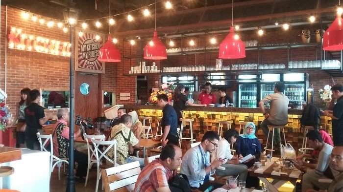 Kincir's interior design was developed with an industrial concept. Iron and wood elements dominate the furnishings here. The red bricks on the walls were left exposed and deliberately not plastered. On one of the walls is a mural painting and a spinning red pinwheel. The pinwheel also indicates that this cafe is open non-stop for 24 hours, even though it is in a mall.