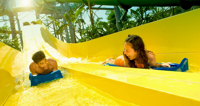 If you want a more relaxed slide, there is The Hairpin, where you and 3 other persons will slide on a tube along the wavy track that will give a sensation of rafting on air. Next, there is The Whizzard, which is similar to Speed Slide but using a mattress as the vehicle. The last one that you must try is Twizter. It is a giant cup on which you will slide through a tunnel then spinning for a few times on the cup walls before being sucked into the second tunnel that will lead you to the swimming pool. Sounds fun, right?