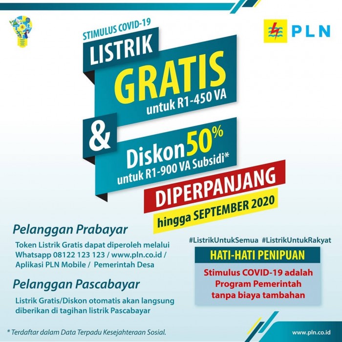 "PLN provides relief to the public during the COVID-19 pandemic, by providing discount to free electricity bill until September 2020."