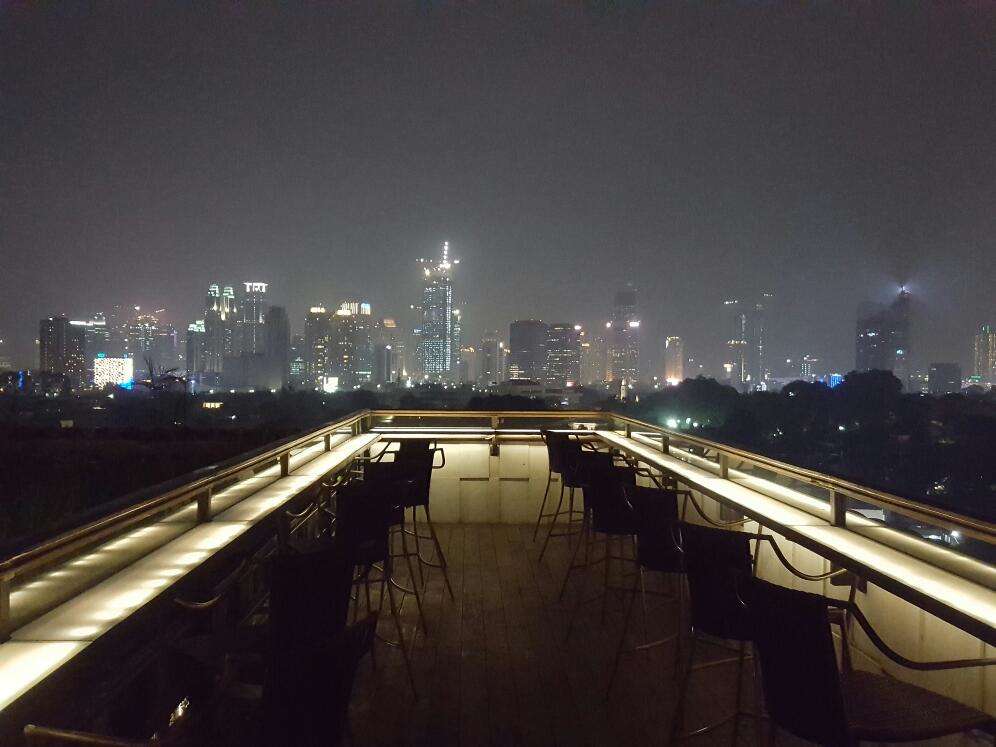 La Vue designed in minimalist touch, its seat area dominated with teak wood and dramatic view of Jakarta skyline, since there were not any electric poles, trees or other skyscraper buildings around this rooftop bar and block the view.