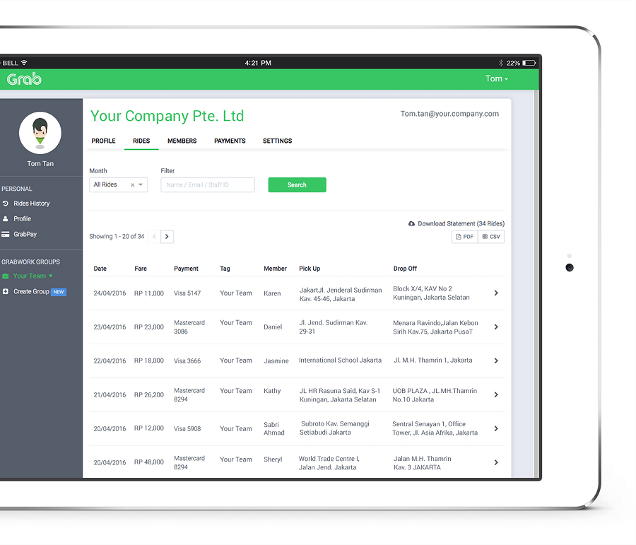 Melalui Grab for Work, perusahaan juga dapat mengontrol perjalanan bisnis karyawan melalui laporan yang disediakan oleh Grab. Laporan ini memungkinkan perusahaan untuk melacak pengeluaran biaya perjalanan bisnis para karyawan sehingga Anda sebagai perusahaan bisa mengatur pengeluaran biaya perjalanan bisnis menjadi lebih baik lagi.