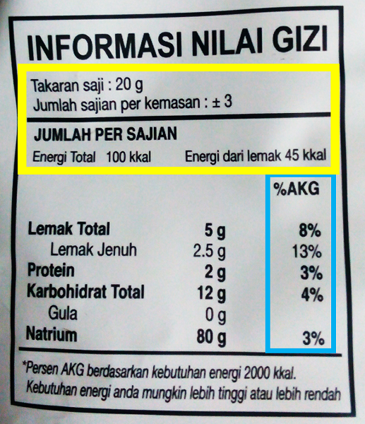 Misalnya tertulis keterangan total lemaknya sebanyak 10%, berarti dengan Anda mengonsumsi sejumlah 1 takaran saji produk tersebut, sudah memenuhi 10% dari total lemak yang dibutuhkan tubuh Anda. Biasanya tertulis %AKG* atau %DV*. Tanda bintang di akhir tersebut bersambung ke catatan kaki yang biasanya berbunyi “%AKG berdasarkan kebutuhan energi 2000 kkal. Kebutuhan energi Anda mungkin lebih tinggi atau lebih rendah.”