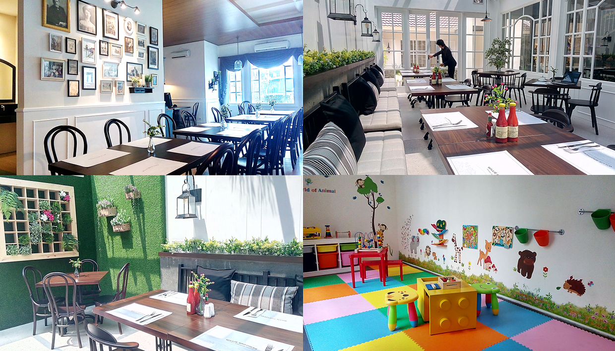 Tempat ini juga menyediakan area bermain khusus anak-anak yang aman dan menyenangkan bagi Anda yang membawa si kecil Desain interior yang dirancang homey dengan dominasi interior kayu dengan warna cokelat gelap dan dipadu dengan warna putih ini, membuat momen bersantap Anda menjadi lebih intim.