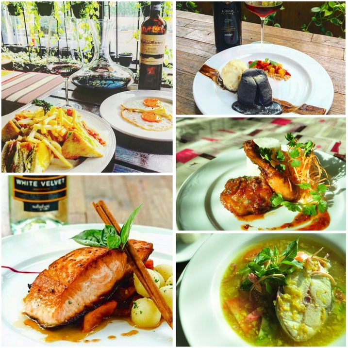 Rasanya kurang ‘nendang’ apabila menikmati wine tanpa ditemani sajian makanan yang lezat. Restoran ini menyajikan masakan Eropa dan Asia. Untuk makanan Eropa Anda dapat menikmati salad, pasta, dan main course yang lezat, yaitu Pan-fried Boneless Chicken Leg a la Provencal, German-style Deep-Fried Pork Knuckle, Grilled Red Snapper Filet, dan berbagai macam sajian steak.