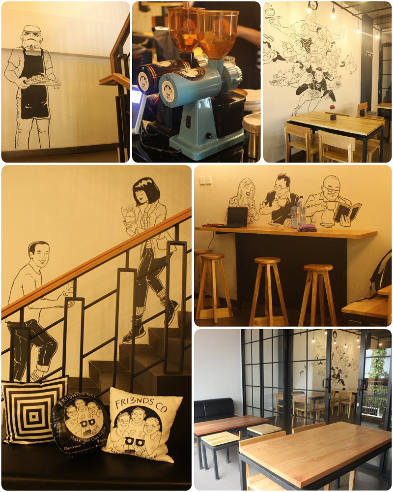 Memasuki Fri3nds.co, Anda bisa melihat berbagai macam seni mural yang tersebar di tiap sisi dinding. Mulai dari gambar berbagai macam orang sedang menikmati kopi hingga Star Wars. Anda juga bisa menemukan mural karikatur para pemilik Fri3nds.co yang terdiri dari tiga orang sahabat yang juga menginspirasi penamaan kafe ini.