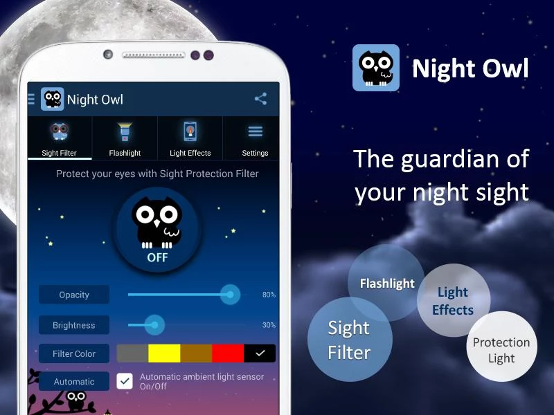 Tak hanya mengurangi blue light, Night Owl juga menyematkan fitur lain seperti Flashlight dan Light Effect. Anda bisa memilih 12 jenis Light Effect yang fun dan unik seperti Psychedelic Light, Mood Light, sampai Police Light.