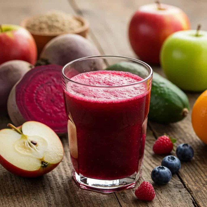 •• Cold-Pressed Urban Elixir – Minuman kesehatan yang dibuat dari kale dan bayam hidroponik yang diproses hanya beberapa menit setelah panen. Warna hijaunya yang sangat pekat mencerminkan kepadatan nutrisi yang masih utuh, memberikan kesegaran yang nyata bagi tubuh.