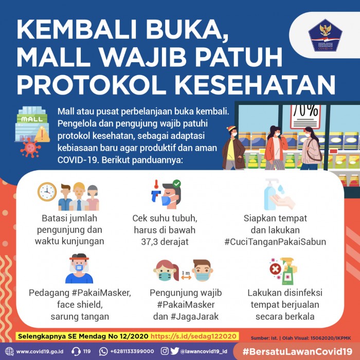 Menteri Kesehatan Terawan Agus Putranto telah menerbitkan Keputusan Menteri Kesehatan nomor HK.01.07/MENKES/382/2020 tentang Protokol Kesehatan bagi Masyarakat di Tempat dan Fasilitas Umum yang disahkan pada 19 Juni 2020. Tempat dan fasilitas umum yang dimaksud di dalamnya termasuk mall.