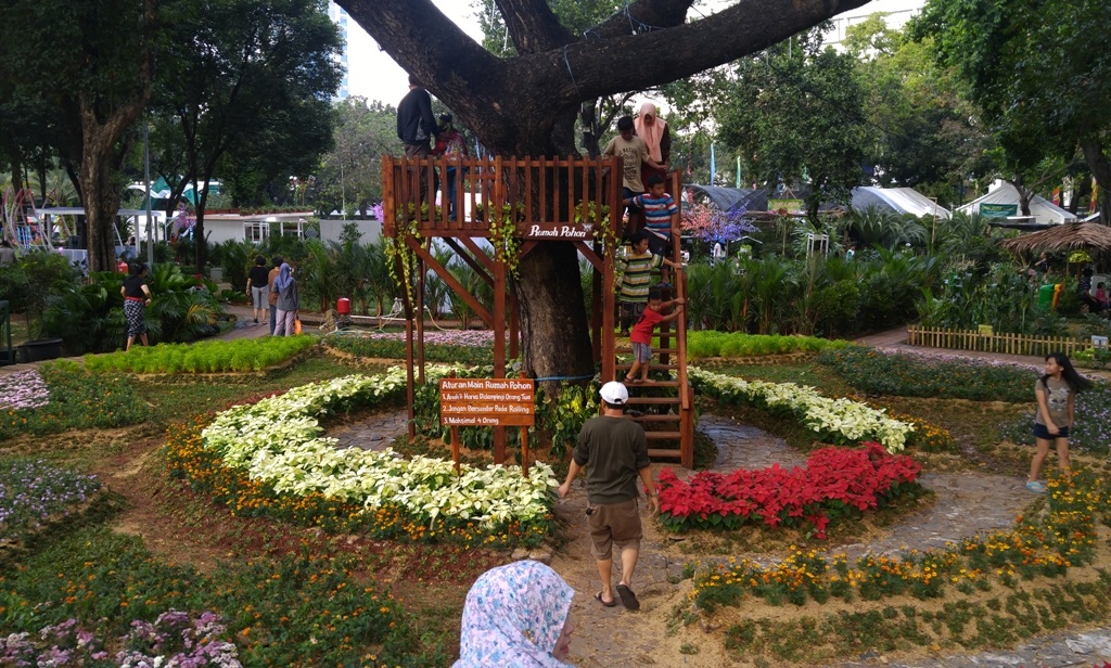 Sebelum direvitalisasi, memasuki area Taman Lapangan Banteng, Anda akan dimanjakan dengan peninggalan acara pameran flona (flora & fauna) pada 21 Juli – 21 Agustus 2017 lalu yang memang rutin diadakan disini, seperti rumah pohon, jembatan pohon, gerbang akar hingga perahu kayu.