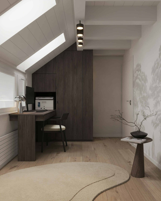 Di ruang kerja, estetika ini diterjemahkan melalui penggunaan material yang apa adanya: meja kayu dengan serat yang terlihat jelas, dinding semen ekspos yang dibiarkan alami, serta pencahayaan yang temaram namun hangat. Tujuannya adalah menciptakan lingkungan yang "jujur", di mana fokus tidak terganggu oleh kemilau furnitur yang berlebihan, melainkan didukung oleh tekstur material yang membumi.